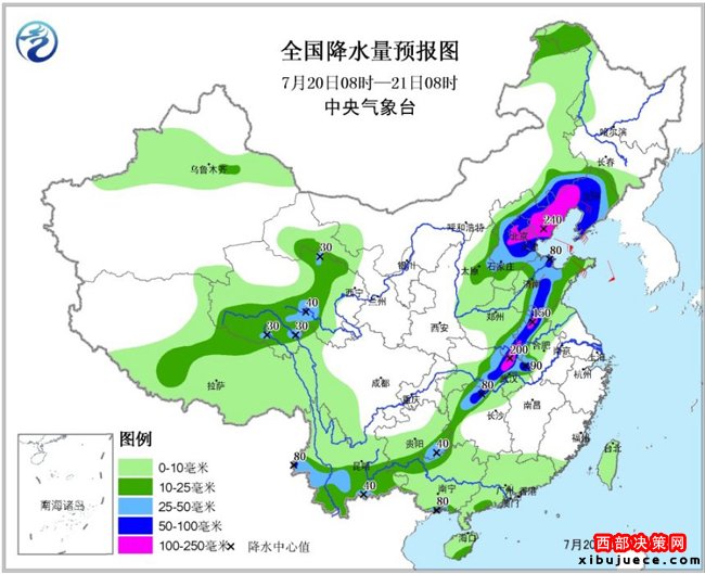 預計,20日08時至21日08時,湖南北部、湖北中東部、河南東南部、安徽西北部、江蘇西北部、山東中部、河北中東部、北京、天津、遼寧中南部及云南西部、廣西南部沿海等地有暴雨,其中,河北東北部、遼寧西南部、北京中南部、天津北部以及湖北中部偏北、河南東南部、安徽西北部等地的部分地區(qū)有大暴雨(100~240毫米);上述地區(qū)局地并伴有短時強降水、雷暴大風等強對流天氣,最大小時雨強50~70毫米,局地可超過80毫米。