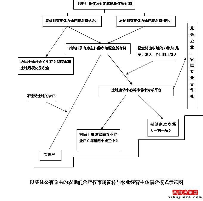 李錄堂向《西部大開發(fā)》介紹,董家?guī)X村示范項(xiàng)目探索建立“以土地集體公有為主,非集體(農(nóng)民)土地所有為輔”的土地集體公有制,通過土地承包經(jīng)營控制權(quán)比例化市場流轉(zhuǎn)試驗(yàn),組建土地股份合作社、家庭農(nóng)場和專業(yè)大戶等經(jīng)營主體,實(shí)行規(guī)模化集約化經(jīng)營,進(jìn)而科學(xué)地解決人多地少條件下土地產(chǎn)權(quán)市場化可能產(chǎn)生的社會不穩(wěn)定因素以及農(nóng)民農(nóng)地產(chǎn)權(quán)自由進(jìn)入和退出問題,讓農(nóng)民“退出土地”有保障,“進(jìn)入土地”有支持,徹底消除農(nóng)民流轉(zhuǎn)土地的后顧之憂,形成“以公有制為主體具有雙重保障的農(nóng)地市場流轉(zhuǎn)機(jī)制”。這一農(nóng)村土地改革的新思路是遵照“以公有制為主體,多種所有制經(jīng)濟(jì)成分并存”的《憲法》原則,借鑒國有企業(yè)劃分國有股、企業(yè)股和企業(yè)全員持股的經(jīng)驗(yàn)及城鎮(zhèn)住房公積金改革的做法,將農(nóng)地產(chǎn)權(quán)(農(nóng)地承包經(jīng)營使用權(quán)等)在集體和農(nóng)民之間按集體占51%,農(nóng)民占49%的比例混合分配后再市場化流轉(zhuǎn)。其中集體所占農(nóng)地產(chǎn)權(quán)及收益總額的51%主要用于農(nóng)民土地社會保障金和農(nóng)地規(guī)?;e金,以解決農(nóng)地市場流轉(zhuǎn)過程中失地失業(yè)農(nóng)民的生存和就業(yè)保障問題,其余49%的收益歸農(nóng)民個人所有,進(jìn)而形成既能保證農(nóng)地集體所有制主導(dǎo)地位,又具有雙重保障和穩(wěn)定性的農(nóng)地產(chǎn)權(quán)市場流轉(zhuǎn)機(jī)制。