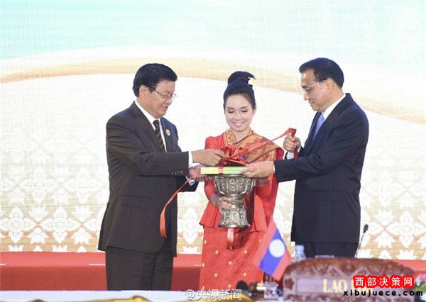 李克強總理7日同東盟10國領(lǐng)導(dǎo)人在老撾萬象共同出席中國—東盟建立對話關(guān)系25周年紀(jì)念儀式。觀看紀(jì)錄短片、發(fā)布對話合作事實與數(shù)據(jù)手冊后,李克強與東盟主席國老撾總理通倫、中國東盟關(guān)系協(xié)調(diào)國新加坡總理李顯龍在與會各國領(lǐng)導(dǎo)人見證下一起切蛋糕。