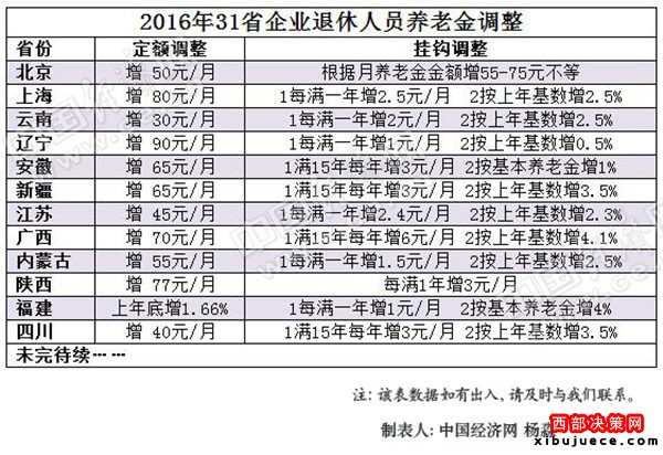 以云南為例,繳費(fèi)年限每滿一年每人每月增加2元,再按本人2015年12月基本養(yǎng)老金的2.5%增加調(diào)整。安徽規(guī)定,繳費(fèi)年限滿15年后滿一年每人每月增加3元,再按本人2015年12月基本養(yǎng)老金的1%增加調(diào)整。中國(guó)經(jīng)濟(jì)網(wǎng)統(tǒng)計(jì),已公布方案省份,大多以此進(jìn)行掛鉤調(diào)整。