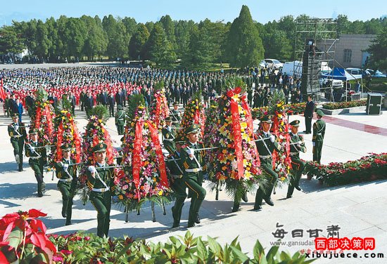 深情的《獻(xiàn)花曲》緩緩奏響,18名禮兵托起省委、省人大常委會、省政府、省政協(xié)、駐甘人民解放軍和武警部隊、民主黨派、蘭州市委、蘭州市人民政府、蘭州社會各界群眾敬獻(xiàn)的9個花籃,緩步走向烈士紀(jì)念碑。