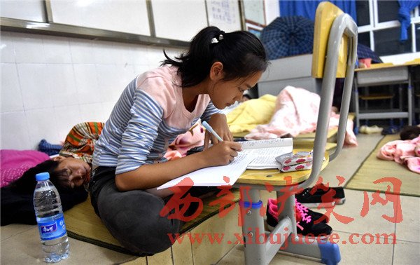 10月18日,在欽州市的臨時安置所內(nèi),高一學生廖凌在寫作業(yè)。