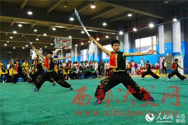 10月22日,云南師范大學(xué)體育學(xué)院的學(xué)生們手持單刀、木棍、長槍等,為參加第九屆“漢語橋”世界中學(xué)生中文比賽的海外選手表演了精彩的中華傳統(tǒng)武術(shù)。一些參賽選手也摩拳擦掌,登臺獻藝,與云南師范大學(xué)的學(xué)生們互相切磋,引得現(xiàn)場一片喝彩。