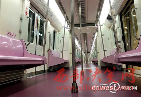 三號線電客車車廂,以粉紫色為基調(diào),座椅、扶手、電客車地面都是“萌萌噠”的粉紫色,車廂里洋溢著濃濃的浪漫。