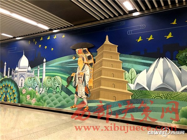 小寨地鐵站的文化墻上,除了有長安的大雁塔、兵馬俑外,還有行走在絲路上的駱駝、以及絲路使者,既彰顯了長安的歷史文化又體現(xiàn)了絲路元素。