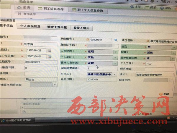 為了進一步了解到底是陜西省交通集團榆靖分公司紀委部造假還是陜蒙界收費站職工(提供的考勤表上有明顯涂改痕跡,天數(shù)是28天)和站長自己(自敘錄音)一起造假。在合療辦調取查看的合療系統(tǒng)顯示,單位編號01000347,名稱陜交建高速榆靖分公司,劉某工資7123元。
