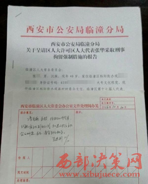 相關(guān)人士向澎湃新聞提供的一份西安市公安局臨潼分局關(guān)于“呈請(qǐng)區(qū)人大許可區(qū)人大代表張華采取刑事拘留強(qiáng)制措施”的報(bào)告顯示,張華,男,家住臨潼區(qū)櫟陽(yáng)街辦觀高村第六組,現(xiàn)任臨潼區(qū)櫟陽(yáng)街辦觀高村村委會(huì)主任,臨潼區(qū)第十七屆人大代表。上面還附有西安臨潼區(qū)人大常委會(huì)辦公室文件處理閱辦箋的擬辦意見(jiàn):“需研究決定”。