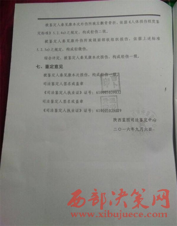秦見(jiàn)康的出院證明和陜西藍(lán)圖司法鑒定中心的鑒定結(jié)果。秦見(jiàn)康供圖秦見(jiàn)康向澎湃新聞提供的中國(guó)人民解放軍第四軍醫(yī)大學(xué)唐都醫(yī)院的出院證明顯示,秦見(jiàn)康7月21日住院,8月9日出院,醫(yī)院診斷結(jié)果顯示其右眼眶壁骨折,右眼限制性斜視,右眼鈍挫傷。陜西藍(lán)圖司法鑒定中心的鑒定結(jié)果顯示,秦見(jiàn)康構(gòu)成輕傷一級(jí)。