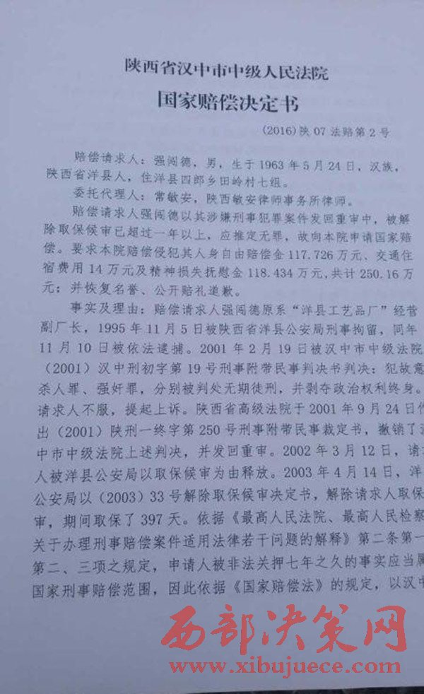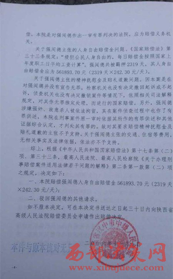 2016年11月9日,陜西省漢中市中級人民法院作出國家賠償決定,國家賠償書上說,根據(jù)《中華人民共和國國家賠償法》的有關規(guī)定,決定賠償強闖德561893.70元。(強闖德共被羈押2319天,每天按242.30元賠償)。而對于強闖德提出的交通、住宿等費用,以及精神賠償?shù)纫?,不予支持?/span>