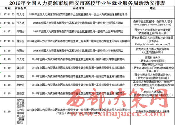 11月17日—11月30日,西安市將舉行2016年全國(guó)人力資源市場(chǎng)西安市高校畢業(yè)生就業(yè)服務(wù)周。期間將舉辦高校畢業(yè)生網(wǎng)絡(luò)招聘大會(huì)、現(xiàn)場(chǎng)招聘會(huì)、人力資源服務(wù)產(chǎn)業(yè)園專場(chǎng)招聘活動(dòng)等29場(chǎng)招聘會(huì),幫助高校畢業(yè)生找到滿意工作。
