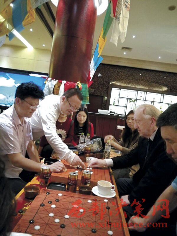 阿旺邊巴(左一)與外國藏棋研究學(xué)者交流藏棋文化。