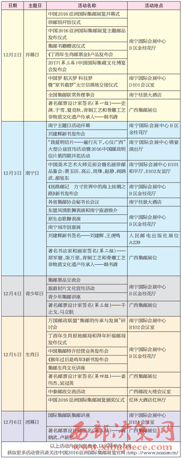 中國(guó)2016亞洲國(guó)際集郵展覽即將于12月2日—6日在南寧舉行,除了精彩的競(jìng)賽性和非競(jìng)賽性展品,郵展期間還將舉辦生肖郵票展示和主題郵局展示等相關(guān)活動(dòng)。展會(huì)還特別設(shè)定了開幕日、南寧日、青少年日、生肖日、閉幕日五個(gè)主題日,下面就來看看每個(gè)主題日都有哪些豐富的活動(dòng)吧。