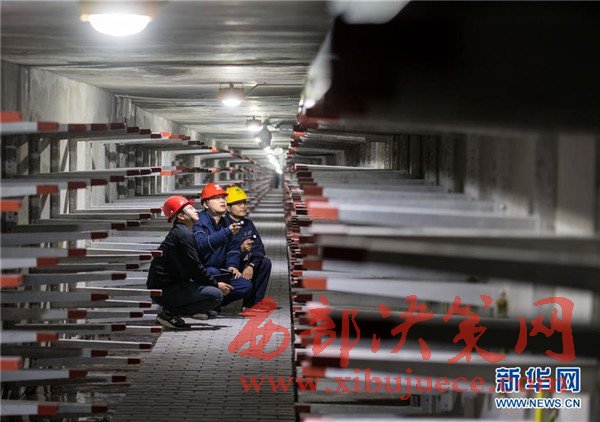 11月24日,解放碑地下環(huán)形電力隧道的一段支線電力隧道內(nèi),兩名國網(wǎng)重慶市區(qū)供電公司的技術(shù)人員(右一、右二)在對預(yù)留的商業(yè)用戶接入隧道的電力設(shè)施設(shè)備進(jìn)行竣工驗收。當(dāng)日,經(jīng)過3年多的緊張建設(shè),重慶地下環(huán)形“電力高速路”——解放碑地下環(huán)形電力隧道工程順利通過竣工驗收,并正式投入運行。解放碑環(huán)形電力隧道總長2408米,其中1198米的干線電力隧道已經(jīng)成功接入解放碑商圈及周邊地區(qū)的4個110千伏變電站形成環(huán)線,支線電力隧道1210米也開始陸續(xù)接入用戶。據(jù)介紹,作為重慶市重點工程,2013年7月開工建設(shè)的解放碑地下環(huán)形電力隧道按照滿足未來20年電力需求設(shè)計,隧道高2.8米、寬2.4米,投入運行后將解決重慶渝中半島和重慶最繁華的解放碑商業(yè)區(qū)配電設(shè)施老化、無法擴建等問題,使解放碑商圈供電負(fù)荷承載能力得到極大加強。