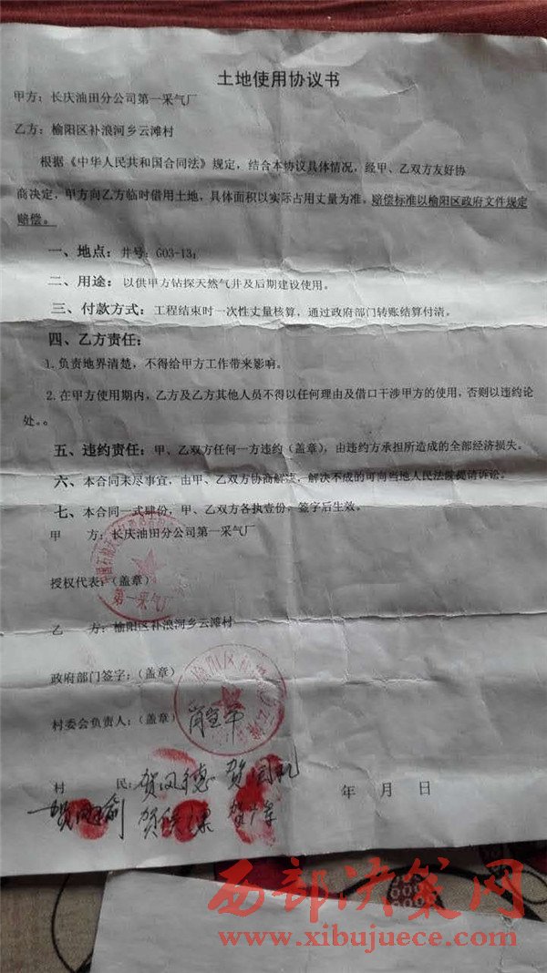 日前,陜西榆林榆陽區(qū)補(bǔ)浪河一村民反映,長慶油田采氣一廠在他們村征地鉆探天然氣井,村民懷疑長慶采氣一廠和他們村委會簽定的《土地使用協(xié)議書》存在著嚴(yán)重的問題。村民向記者看了一份所謂的巜土地使用協(xié)議書》,記者看到這份漏洞百出的協(xié)議書,協(xié)議書的甲方是長慶油田采氣一廠分公司,而協(xié)議書公章是中國石油天然氣長慶股份有限公司(……)分公司,幾個(gè)關(guān)鍵的字根本看不清楚,不知道這個(gè)沒有蓋清楚公章的協(xié)議書到底想掩蓋什么?還是這枚公章就是一枚假公章。協(xié)議書的甲方名稱為什么和公章名稱不符呢?