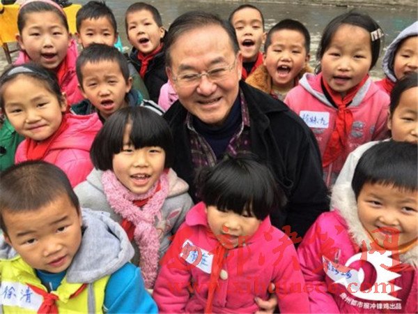 (2013年,葉其超到遵義市務(wù)川縣涪洋鎮(zhèn)雙河小學(xué)看望學(xué)生,他們身后的新樓是葉其超捐款50萬元援建的希望食堂、宿舍。)