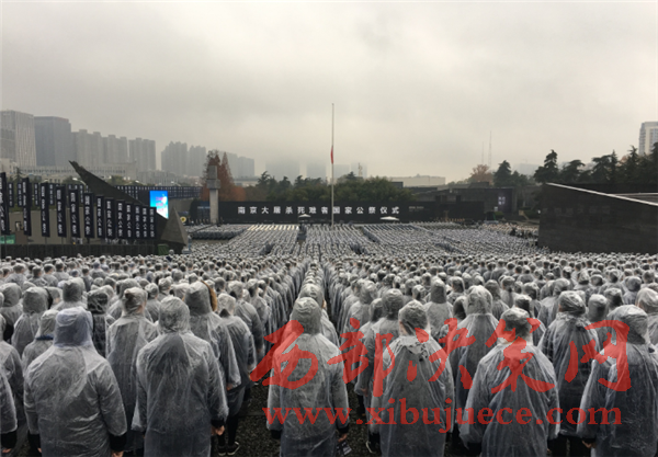 12月13日,十時(shí)整,雨中,南京大屠殺死難者國(guó)家公祭儀式在南京大屠殺遇難同胞紀(jì)念館隆重舉行。8000人冒雨參加了公祭,向30萬(wàn)遇難同胞致哀,場(chǎng)面莊嚴(yán)肅穆。國(guó)家公祭儀式從上午10點(diǎn)正式開(kāi)始,南京全城鳴笛致哀。