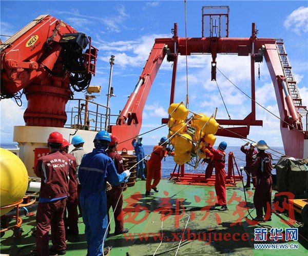 在深海潛標回收作業(yè)中,潛標主浮體和玻璃浮球浮出水面(11月18日攝)。我國遠洋綜合考察船“科學”號正在西太平洋執(zhí)行潛標觀測網(wǎng)維護與升級任務(wù)。截至目前,科考隊員已獲取了140余件觀測設(shè)備連續(xù)1年的現(xiàn)場數(shù)據(jù),維護了8套深海潛標,并重新布放至西太平洋海域。