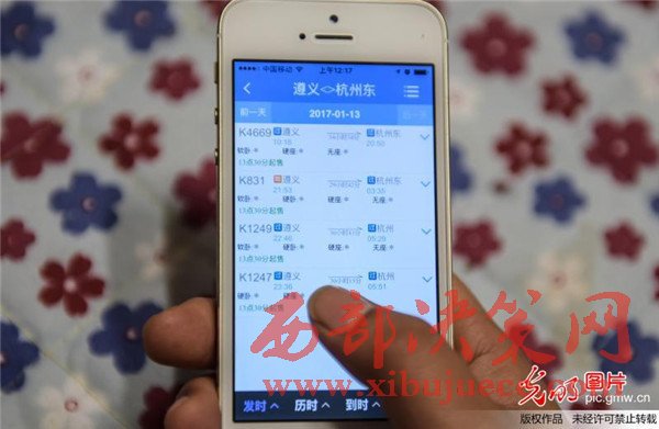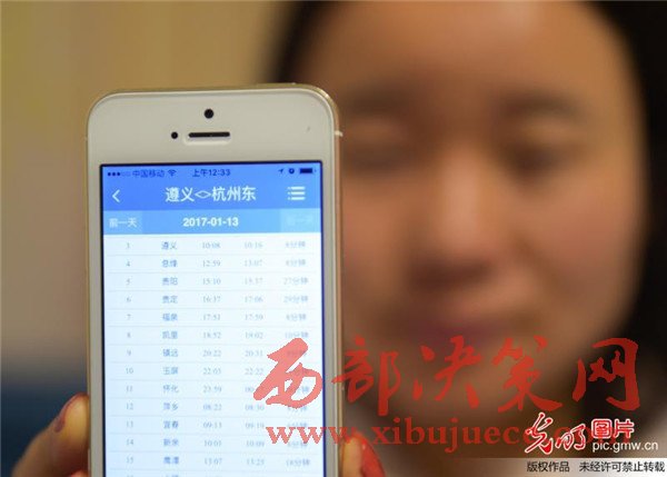 2016年12月15日,一名貴州省余慶縣市民通過手機(jī)客戶端購買春運(yùn)首日的車票。
