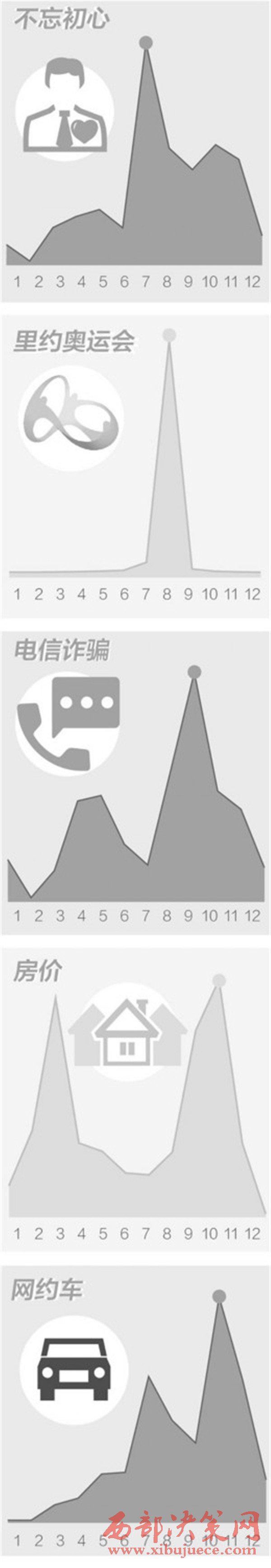 圖表說明:根據(jù)2016年網(wǎng)民在百度上對(duì)以上關(guān)鍵詞的逐月搜索數(shù)據(jù)繪制,搜索指數(shù)的上升和下降反映各關(guān)鍵詞搜索頻次的變化。