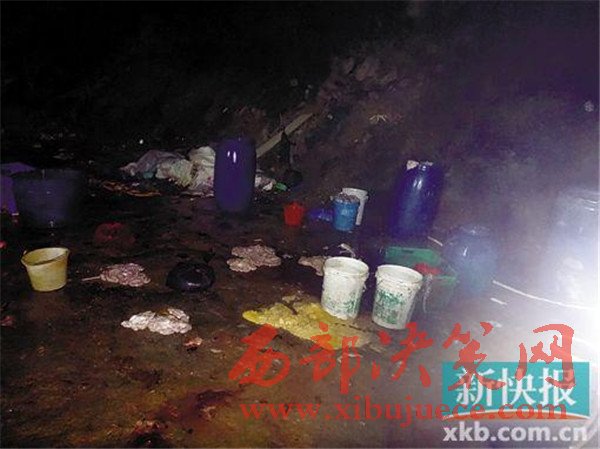 在查獲現(xiàn)場,違法人員臨時搭建的私宰帳篷里,地上鋪滿了豬血和豬毛的混合物,生豬糞便隨著水流漸漸形成一條“小河”流向遠處,殺豬刀、鐵鉤、鐵叉等用于私宰的工具隨意擺放在地上,與豬毛、豬血、糞便等混合在一起。現(xiàn)場一口直徑近2米的大鍋盛滿了水,熱氣騰騰。