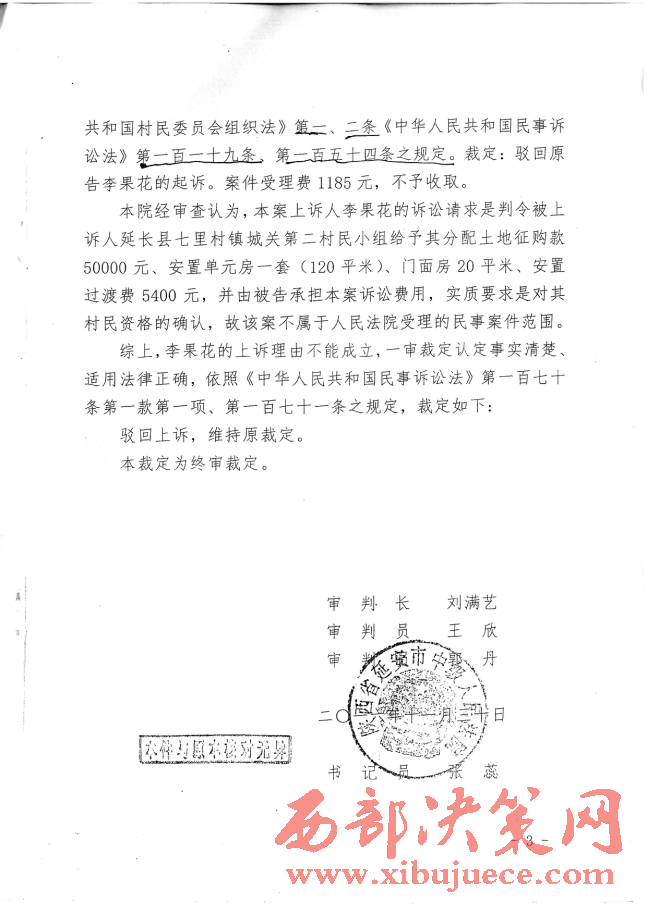 記者又多次翻閱了延長縣人民法院(2016)陜0621號民初541號民事裁定書和延安市中級法院(2016)陜06民終1658號民事裁定書,兩級法院都用同樣的理由是:“李果花的訴訟請求是判令被上訴人延長縣七里村鎮(zhèn)城關(guān)二村民小組給予其分配土地征購款50000元,安置單元房一套(120平米),門面房20平米,安置過渡費5400元,并由被告承擔(dān)案件訴訟費用,實質(zhì)要求是對其村民資格的確認,故該案不屬于人民法院受理的民事案件范圍。”一審法院駁回起訴,二審法院是駁回上訴,維持原判。正如反映人李果花稱:“我訴訟的是要回我合法的土地征購款、安置房、門面房、安置過渡費。村民的資格確認,我有的合法的戶口簿、身份證,又有鎮(zhèn)政府領(lǐng)導(dǎo)、村干部、村民代表的協(xié)議書還不夠嗎?”