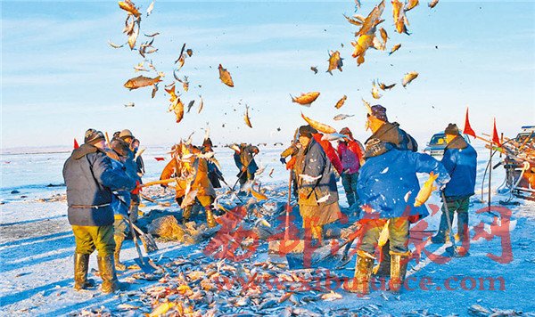 圖為12月26日,呼倫湖漁業(yè)公司工人拋魚作業(yè),讓魚盡快凍結(jié)。