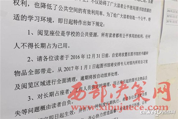 記者看到就在圖書館的入口貼著圖書館關于清理閱覽室座位的通知,上門寫著因為館內(nèi)占座問題屢禁不止,請同學們在12月31號前將自己的物品帶走,從1月1號起將全面清理閱覽室,通知貼出的時間是12月28號。