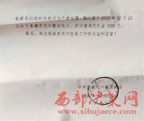2016年12月27日鳳縣河口鎮(zhèn)人民政府回饋:經(jīng)鳳縣河口鎮(zhèn)紀委查處,對涉事人鳳縣河口鎮(zhèn)唐溝村支部書記秦建錄黨內(nèi)警告處分,并收繳違紀禮金3300元。