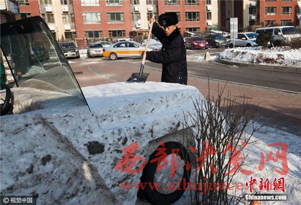 這輛雪雕“敞篷跑車”的制作者,是小區(qū)里的四名保安。“做這個雪雕,就是想讓這里的居民看見雪雕,能樂呵樂呵,我們做完這個,也挺高興的。”