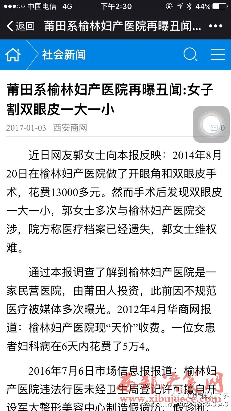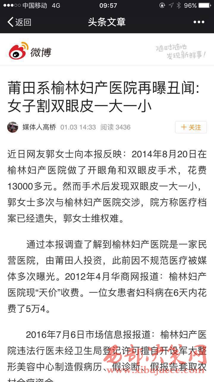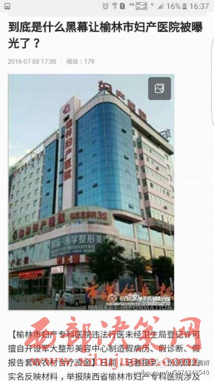 2016年7月6日市場信息報報道:榆林婦產(chǎn)醫(yī)院違法行醫(yī)未經(jīng)衛(wèi)生局登記許可擅自開設(shè)軍大整形美容中心制造假病歷、假診斷、假報告套取農(nóng)村合療資金。