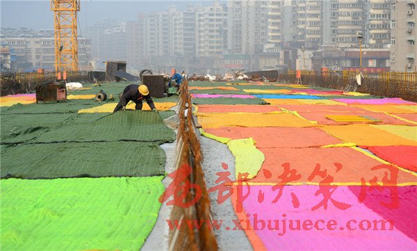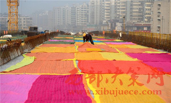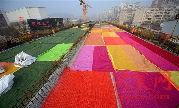 2017年1月2日,濟(jì)南,在七里山路附近的順河高架橋南延施工現(xiàn)場,百余米長的高架橋路面鋪設(shè)了彩色的棉被,總數(shù)達(dá)到100多條,覆蓋面積約2000多平方米 。據(jù)了解,該段高架橋?yàn)樾聺仓南淞?,為確保冬季低溫下混凝土能夠保證強(qiáng)度和防凍,施工采取多種保暖法,為路面蓋棉被取暖。