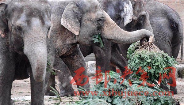 當?shù)貢r間2017年1月3日,德國柏林,Zoologischer Garten動物園的大象們食用“圣誕樹”美食大餐。