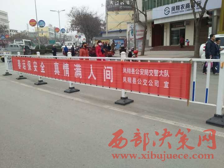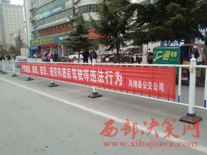 西部決策網(wǎng)訊(帥華鋒 李亮亮 通訊員 孟歡)為切實(shí)做好2017年春運(yùn)期間道路交通安全宣傳工作,引導(dǎo)群眾安全、文明出行,營(yíng)造和諧、平安的春運(yùn)道路交通安全氛圍。近日,鳳翔大隊(duì)根據(jù)汽車(chē)客運(yùn)站、鎮(zhèn)街要道春運(yùn)期間人流車(chē)流量較大的特點(diǎn),將印有“文明交通你我他,平安出行靠大家”、“祝千家萬(wàn)戶家家團(tuán)圓 愿四方旅客路路平安”、“秩序保障安全,規(guī)則守護(hù)生命”、“滴酒不沾,一路平安”等交通安全宣傳標(biāo)語(yǔ)的橫幅懸掛在東大街、南大街、東大街、秦鳳路等主干道防護(hù)欄醒目位置,為春運(yùn)安全行駛營(yíng)造濃厚的宣傳氛圍。