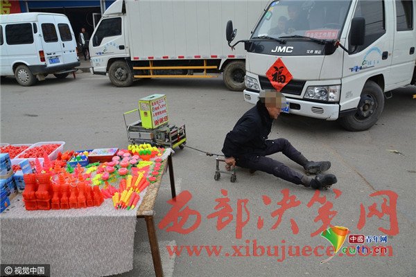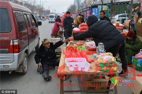 2017年2月6日,在山東省日照市莒縣南關(guān)大集上,今年58歲的葛平九,坐在他自己制作的小車上,用兩只手臂作支撐,拖著一雙殘腿,穿梭在車流和人流之間,向路邊賣蠟燭的攤位要求施舍。有愛(ài)心的攤主會(huì)給他一塊錢,有的會(huì)給他一根蠟燭。
