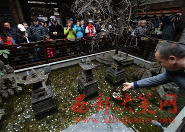 中午時(shí)分,記者又一次仔細(xì)觀察了水池,在游人拋投硬幣時(shí),確實(shí)有一兩條金色的觀賞魚(yú)在石縫處游動(dòng)著。在木制欄桿四周,正貼著“禁止倚靠欄桿”、“禁止投幣”等字樣。“春節(jié)游客爆滿(mǎn),水池是從寬巷子到窄巷子的必經(jīng)之道,加上很多人在拋硬幣,頓時(shí)人滿(mǎn)為患。我們只好打印了幾張?zhí)嵝褟堎N起來(lái)。”辦公室工作人員還表示,“等春節(jié)游客潮稍微退卻,天氣回暖,我們就要派人下水打撈這些硬幣,用于景點(diǎn)建設(shè)。”