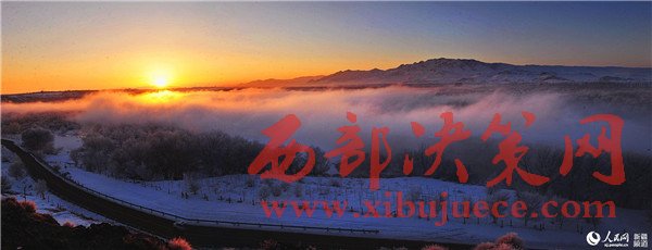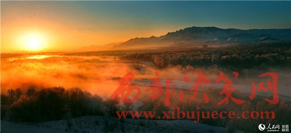 綿延百里的新疆尼勒克縣喀什河谷次生林在冷空氣的作用下,霧氣蒸騰,21萬(wàn)畝林帶凝成了玉樹(shù)瓊花的霧凇景觀(guān)。迎著日出的霞光,從山上向下俯視,整個(gè)河谷云蒸霞蔚,宛如置身云端。翻滾的云海讓遠(yuǎn)山和近樹(shù)若影若現(xiàn),恍若仙境。待太陽(yáng)升高,再浮現(xiàn)河谷次生林帶,猶如一條晶瑩剔透的玉帶飄落在天山之下。