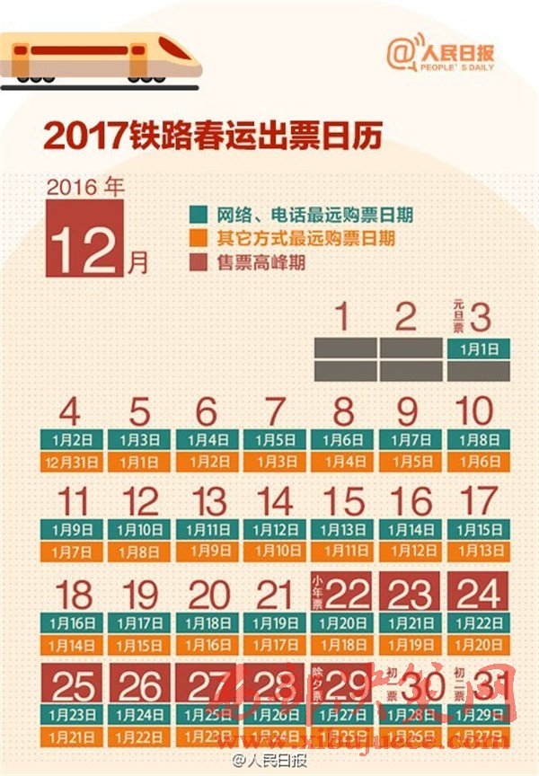 2017年春運(yùn)從1月13日至2月21日,是近5年來開始時間最早的春運(yùn),你做好搶票準(zhǔn)備了嗎?目前火車票預(yù)售期30天,除夕當(dāng)天的票12月29日開搶,網(wǎng)絡(luò)購票須在30分鐘內(nèi)付款,發(fā)車前2天或12小時可“撿漏”。