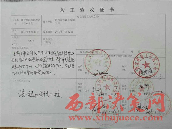 隨后,我社工作人員來(lái)到鎮(zhèn)安縣城建局反映問(wèn)題,城建局稱:“工程于2016年1月份竣工,現(xiàn)已移交城管局,不屬于我們管”。并拿出了工程竣工證書(shū),證書(shū)上證明此工程已移交城管局。