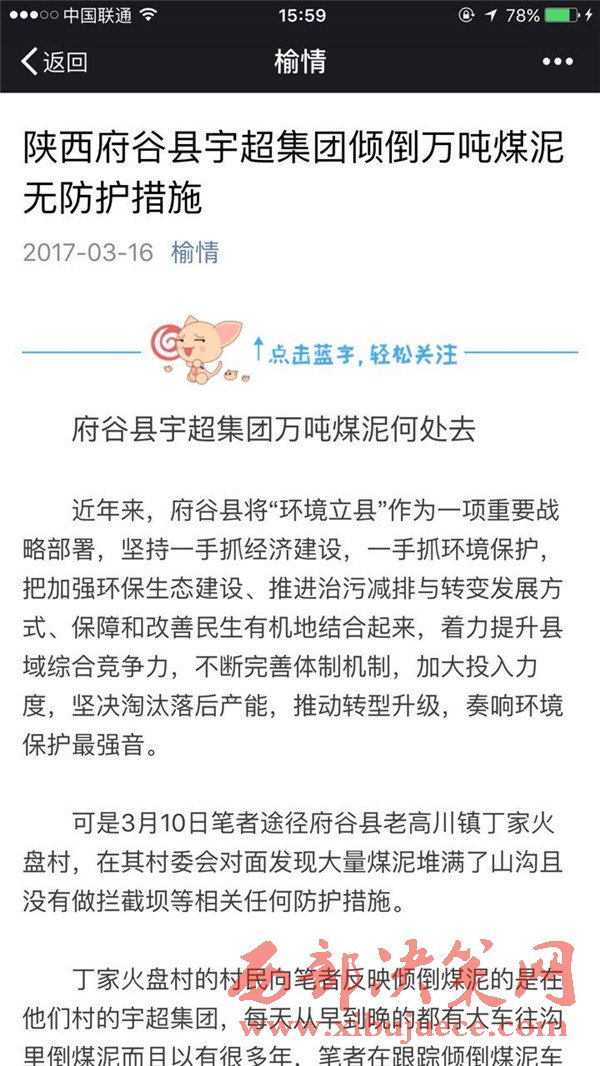 丁家火盤(pán)村的村民向筆者反映傾倒煤泥的是在他們村的宇超集團(tuán),每天從早到晚的都有大車(chē)往溝里倒煤泥而且以有很多年,筆者在跟蹤傾倒煤泥車(chē)證實(shí)了村民的說(shuō)法,筆者通過(guò)撥打12369環(huán)保熱線將此事反映給了府谷縣環(huán)保局,環(huán)保局的同志說(shuō)會(huì)立即調(diào)查并向筆者反饋調(diào)查結(jié)果。