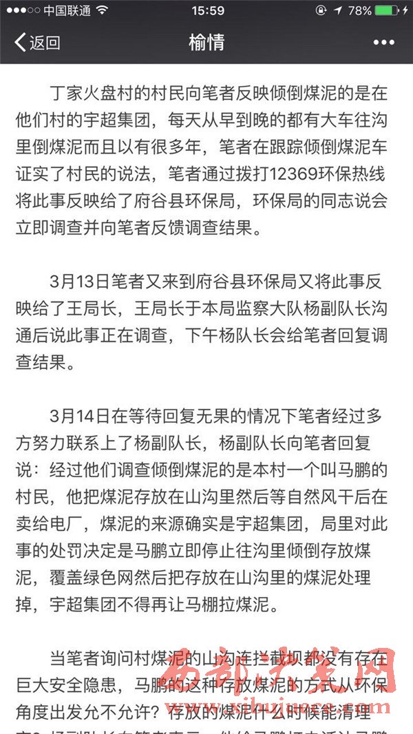 3月14日在等待回復(fù)無(wú)果的情況下筆者經(jīng)過(guò)多方努力聯(lián)系上了楊副隊(duì)長(zhǎng),楊副隊(duì)長(zhǎng)向筆者回復(fù)說(shuō):經(jīng)過(guò)他們調(diào)查傾倒煤泥的是本村一個(gè)叫馬鵬的村民,他把煤泥存放在山溝里然后等自然風(fēng)干后在賣(mài)給電廠,煤泥的來(lái)源確實(shí)是宇超集團(tuán),局里對(duì)此事的處罰決定是馬鵬立即停止往溝里傾倒存放煤泥,覆蓋綠色網(wǎng)然后把存放在山溝里的煤泥處理掉,宇超集團(tuán)不得再讓馬棚拉煤泥。