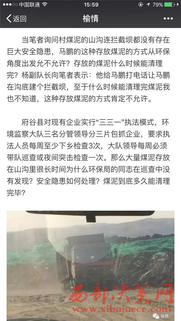 3月13日筆者又來(lái)到府谷縣環(huán)保局又將此事反映給了王局長(zhǎng),王局長(zhǎng)于本局監(jiān)察大隊(duì)楊副隊(duì)長(zhǎng)溝通后說(shuō)此事正在調(diào)查,下午楊隊(duì)長(zhǎng)會(huì)給筆者回復(fù)調(diào)查結(jié)果。