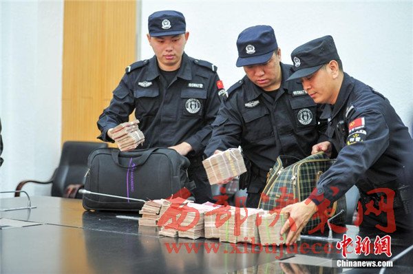 沈陽警方現(xiàn)場展示被盜贓款。