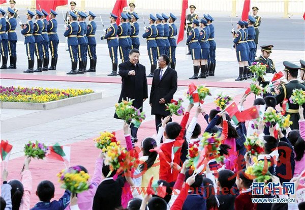 會(huì)談前,習(xí)近平在人民大會(huì)堂東門外廣場為埃里舉行歡迎儀式。習(xí)近平主席夫人彭麗媛、全國人大常委會(huì)副委員長嚴(yán)雋琪、國務(wù)委員楊潔篪、全國政協(xié)副主席李海峰等出席。