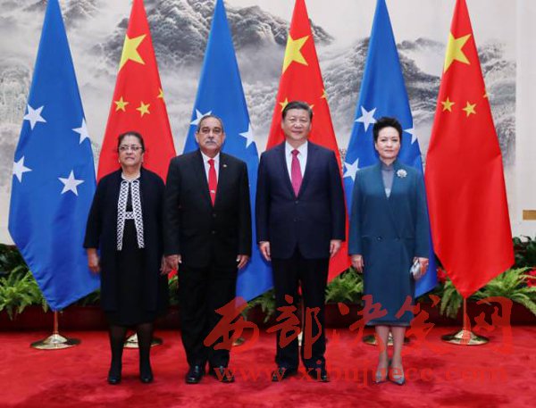 3月27日,國家主席習(xí)近平在北京人民大會(huì)堂同密克羅尼西亞聯(lián)邦總統(tǒng)克里斯琴舉行會(huì)談。會(huì)談前,習(xí)近平在人民大會(huì)堂東門外廣場為克里斯琴舉行歡迎儀式。這是習(xí)近平和夫人彭麗媛同克里斯琴總統(tǒng)夫婦合影。