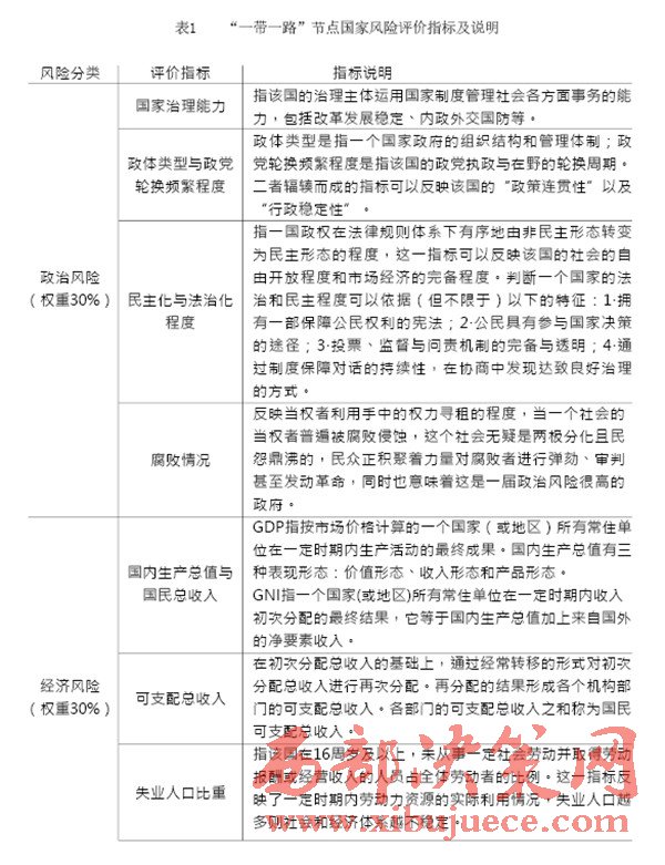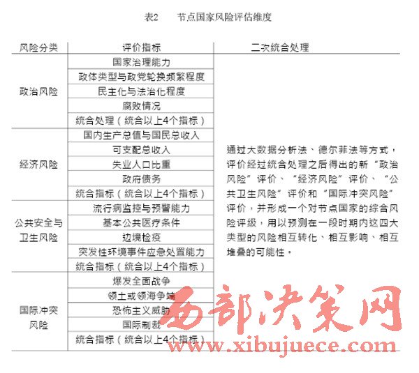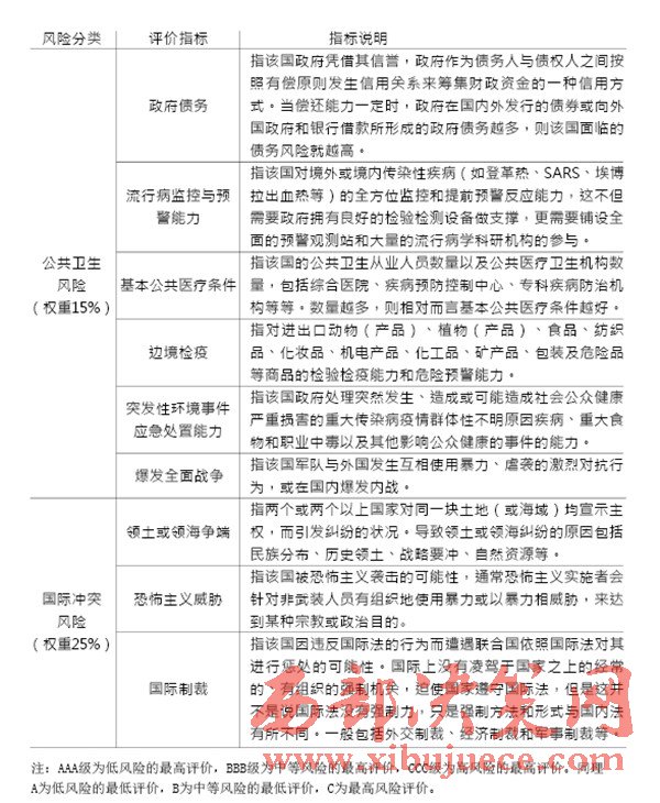 “一帶一路”建設(shè)中重要國家的治理風險是我們的主要關(guān)注對象,在借助國內(nèi)外智庫和科研院所已完成的眾多研究成果的基礎(chǔ)上,建立一套對節(jié)點國家風險的評級體系,如表1(見P28)所示。節(jié)點國家風險評價指標中,政治風險與經(jīng)濟風險的評價參考經(jīng)濟學人智庫的國家風險模型(EIU country risk model);公共衛(wèi)生風險的評價參考中國衛(wèi)生與經(jīng)濟社會發(fā)展統(tǒng)計數(shù)據(jù)庫對公共衛(wèi)生的指標設(shè)計;國際沖突風險評價根據(jù)經(jīng)濟學人智庫發(fā)布的白皮書《愿景與挑戰(zhàn)——“一帶一路”沿線國家風險評估》與中國出口信用保險公司發(fā)布的2015年版《國家風險分析報告》和《全球風險地圖》綜合考量得出。具體而言,我們可以從“政治風險”“經(jīng)濟風險”“公共衛(wèi)生風險”和“國際沖突風險”四個維度來評估選擇出的節(jié)點國家的風險,如表2(見P30)所示。