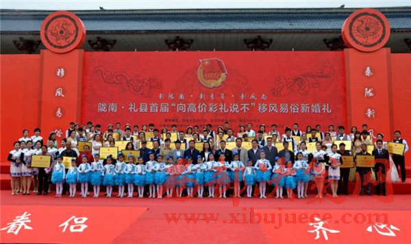 5月7日,甘肅隴南禮縣秦文化廣場(chǎng)上人潮如海,喜氣洋洋。倍受社會(huì)關(guān)注的隴南市首屆“向高價(jià)彩禮說不”移風(fēng)易俗新婚禮在這里隆重舉行。來自禮縣各鄉(xiāng)鎮(zhèn)精準(zhǔn)扶貧戶中的30對(duì)新人以隆重儉樸的新婚儀式喜結(jié)連理,見證了彼此的愛情。