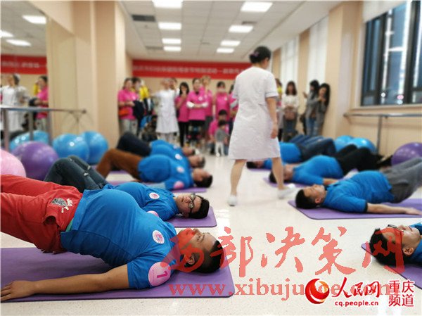 準(zhǔn)爸爸們體驗(yàn)孕婦瑜伽,幾分鐘后,不少人累得氣喘吁吁。