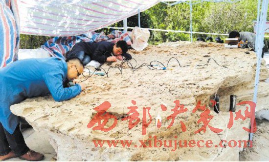 哈密科考隊(duì)隊(duì)員周紅嬌介紹,從2006年起,科考隊(duì)在哈密魔鬼城一帶搜尋早白堊紀(jì)翼龍以及其它恐龍化石,2016年10月,科考隊(duì)在魔鬼城發(fā)現(xiàn)了這個化石界的“大塊頭”。當(dāng)時我們是在一處坍塌的雅丹地貌上發(fā)現(xiàn)的,已被風(fēng)化得很嚴(yán)重,如不及時保護(hù),很可能會受到更大損害。在與哈密博物館協(xié)商后,于當(dāng)年11月16日,將其運(yùn)送到哈密博物館,今年4月份開始修復(fù)。”周紅嬌說,修復(fù)時,先使用機(jī)械設(shè)備清理化石周圍的圍巖,因?yàn)轱L(fēng)化比較嚴(yán)重,表層比較脆弱,因此修復(fù)時要十分小心,最后用氣吹和手捻手動清理。清理完畢后,會噴涂一層保護(hù)膠,用來保護(hù)化石。