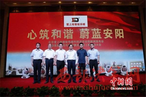 近日,北京愛上地智能電暖科技進駐安陽新聞發(fā)布會在安陽舉辦,本次發(fā)布會主題為——“心筑和諧蔚藍安陽”,旨在通過加快推進清潔取暖,讓民心更暖天更藍。安陽市人民政府副市長田海濤、安陽市殷都區(qū)委常委、常務(wù)副區(qū)長馬衛(wèi)、殷都區(qū)商務(wù)局局長李昳嫻、北京愛上地科技有限公司董事長叢建光參加了發(fā)布會。