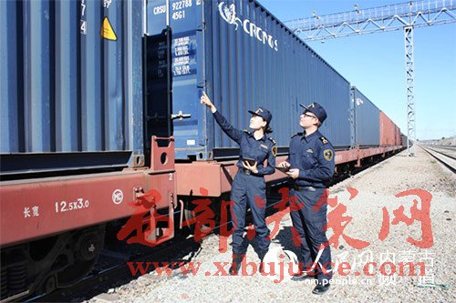 滿洲里海關(guān)關(guān)員正在對準(zhǔn)備從滿洲里口岸出境的中歐班列辦理快速驗(yàn)放手續(xù)。